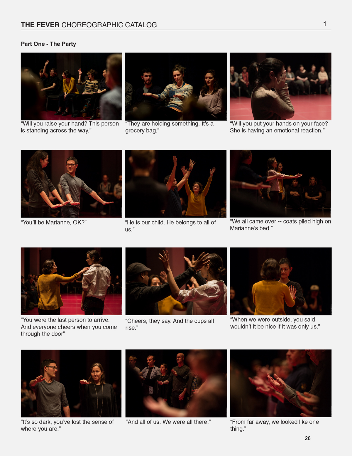 This page includes documentation generated from the creative development and performance of The Fever, performed in collaboration with the audience. These materials speak to the fixity and stability of the script, in contrast to the changeful instability of the audience’s participation in real time.