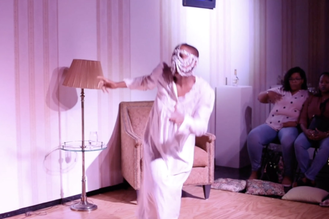 Towards the end of the first clip, Jennifer Harge, a tall Black femme, washes her feet inside a large metal basin. She wears white underwear and a headpiece with loops cascading down her face, encrusted in diamonds. Aretha Franklin's "Never Grow Old" envelops her. Her fingertips trace the distance of her leg as she moves to standing. Water droplets form beads on her skin. In a new scene, she’s in a living room dancing in front of a Television set. As the camera pans across the space, she appears like a spirit or ghost-figure channeling the memories and effects of this place. Her body dwells, moves, lives. There’s a quality of being home; her body is a kind of home. The wall by the mantel is painted in a deep red brick color, giving a somber and noble quality. She cleanses her face, drinking from a metal stockpot, in front of a wall of black-and-white framed portraits of Black women. In a new scene, she sleeps in a large living room chair. The light illuminates the top right corner of the frame. The wallpaper is composed of vertical stripes in white and creamsicle colors. Now, she is dancing in a long white nightgown. This time there’s an audience. She breathes, claws the air, pants and pauses. She rests in the wash basin, bathed in electric blue light. She emerges from the water and a Black femme adorns her with a pyramid-shaped crown covered in jewels. She sweeps the room. A poem about ancestors and ghosts washes over the space.(1)