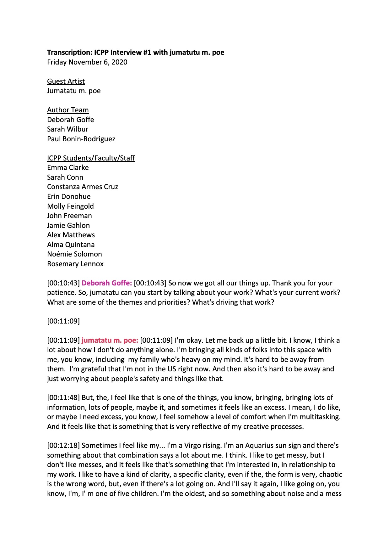 jumatatu m. poe participated in ICPP’s Doris Duke Charitable Foundation Performance Artist Case Studies beginning in 2020.